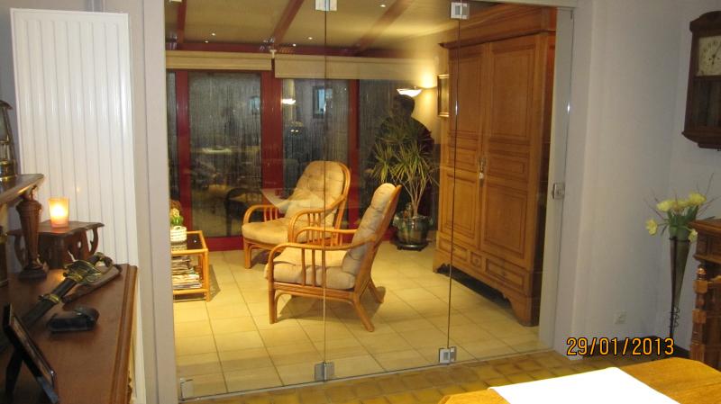 Porte en verre clair, système accordéon, permet l'ouverture soit de la porte seule ou de l'ensemble.