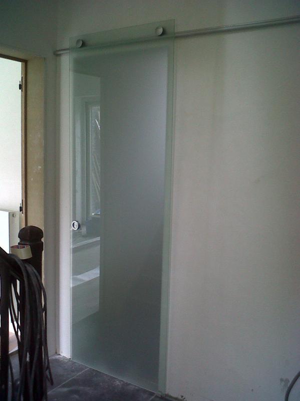 Porte en verre acidé monté sur rail apparent Inox et roues apparentes, poignée rosace