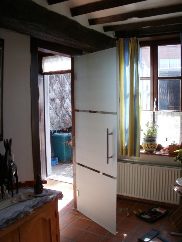 Porte en verre sablé avec 2 lignes clairs monté sur charnières et tirant inox